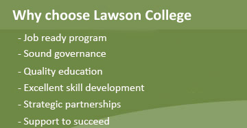 Lawson College provides exceptional educational programs as well as skills training in association with various partners hence providing quality assurance framework which includes sound governance. Lawson College ensures continuous quality improvement by diligently bench marking its compliance, operations, partnerships and professional experience processes and practices, against best possible practices in various universities and colleges in Australia.